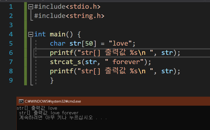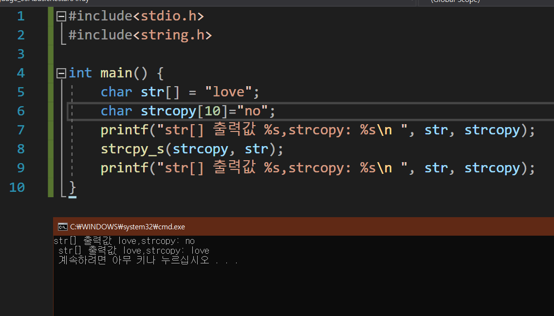 printf("str[] 출력값 %s,strcopy: %s\n ", str, strcopy);