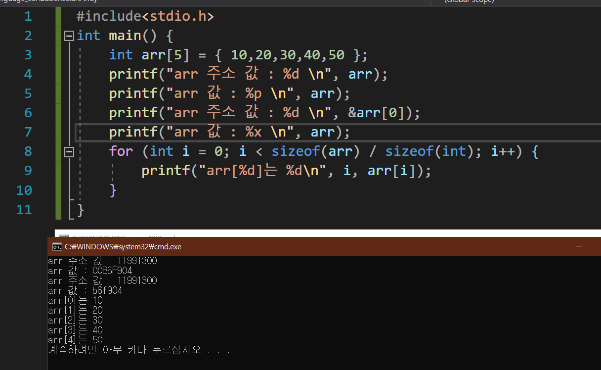 printf("arr 주소 값 : %d \n", &arr[0]);
