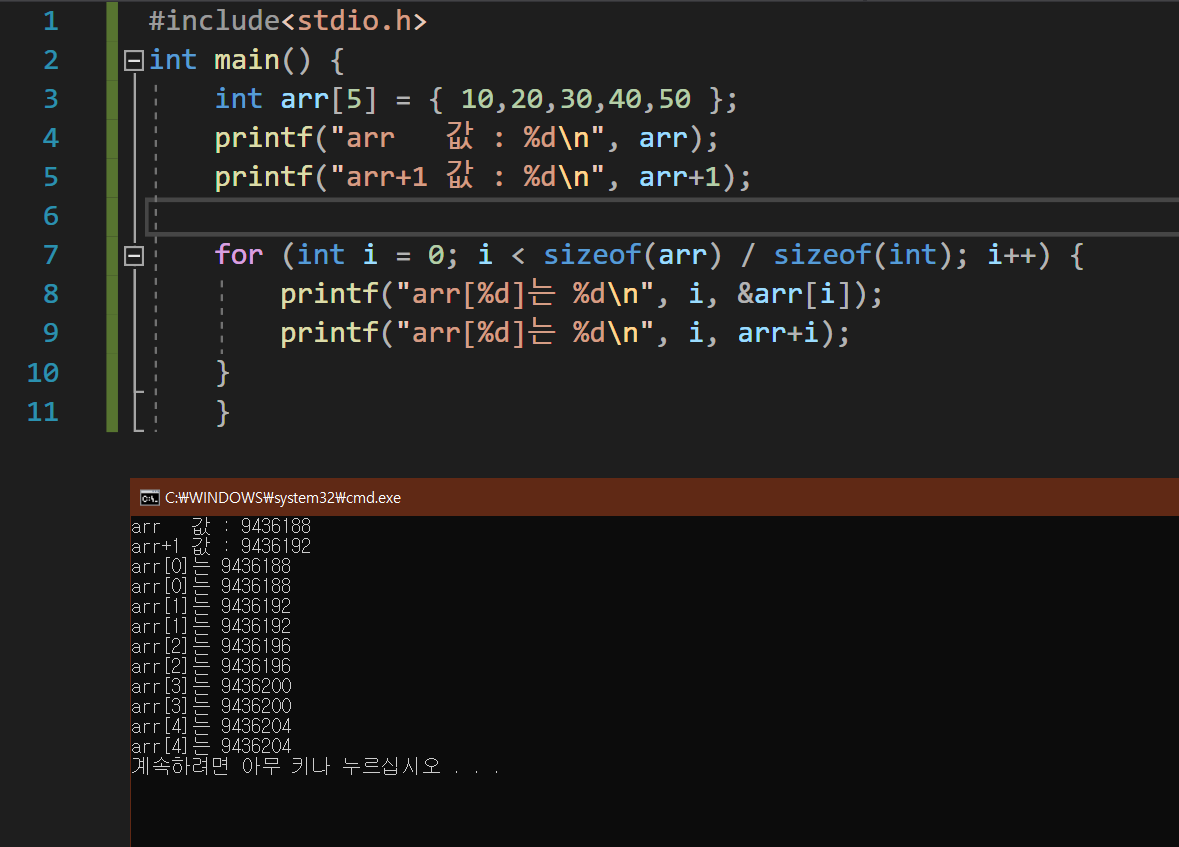 arr 과 arr1+1의 값을 보면 알 수 있듯이 배열 요소의 자료형의 크기(4바이트) 만큼 증가하는 것을 볼 수 있습니다.