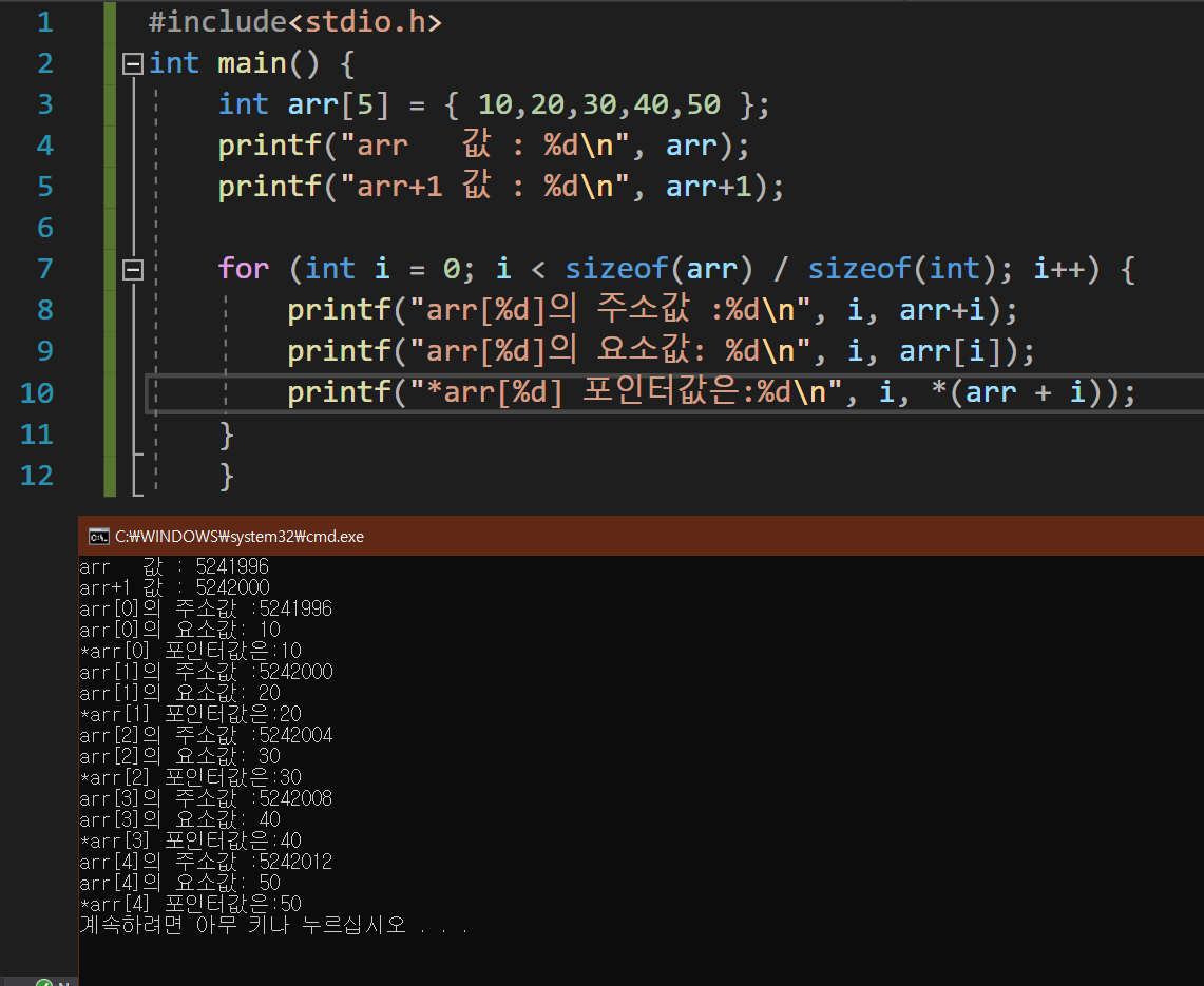 printf("*arr[%d] 포인터값은:%d\n", i, *(arr + i));
