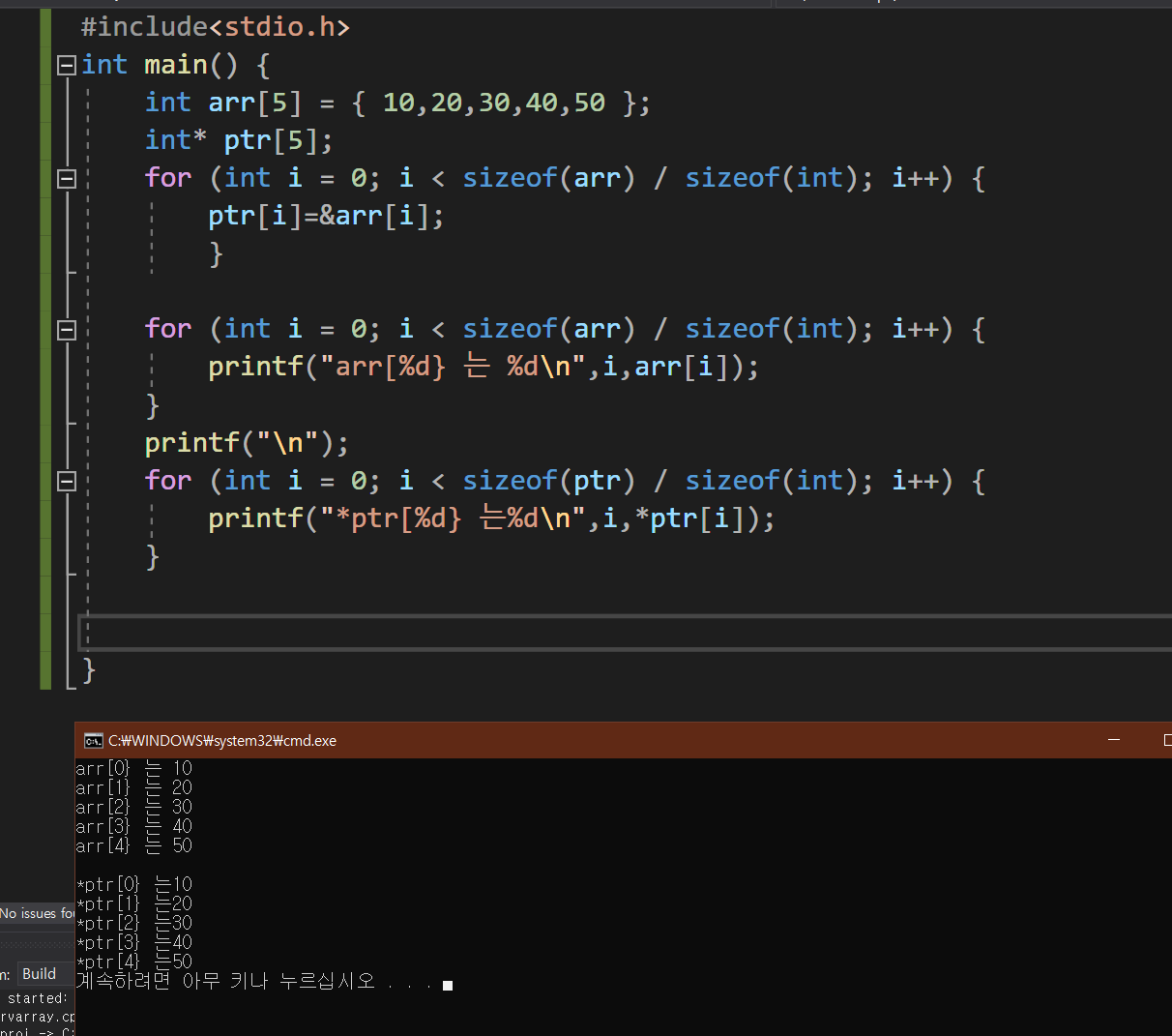 arr[5]값을 그대로 포인터 배열로 *ptr[5]로 만들어진것을 알 수 있습니다.