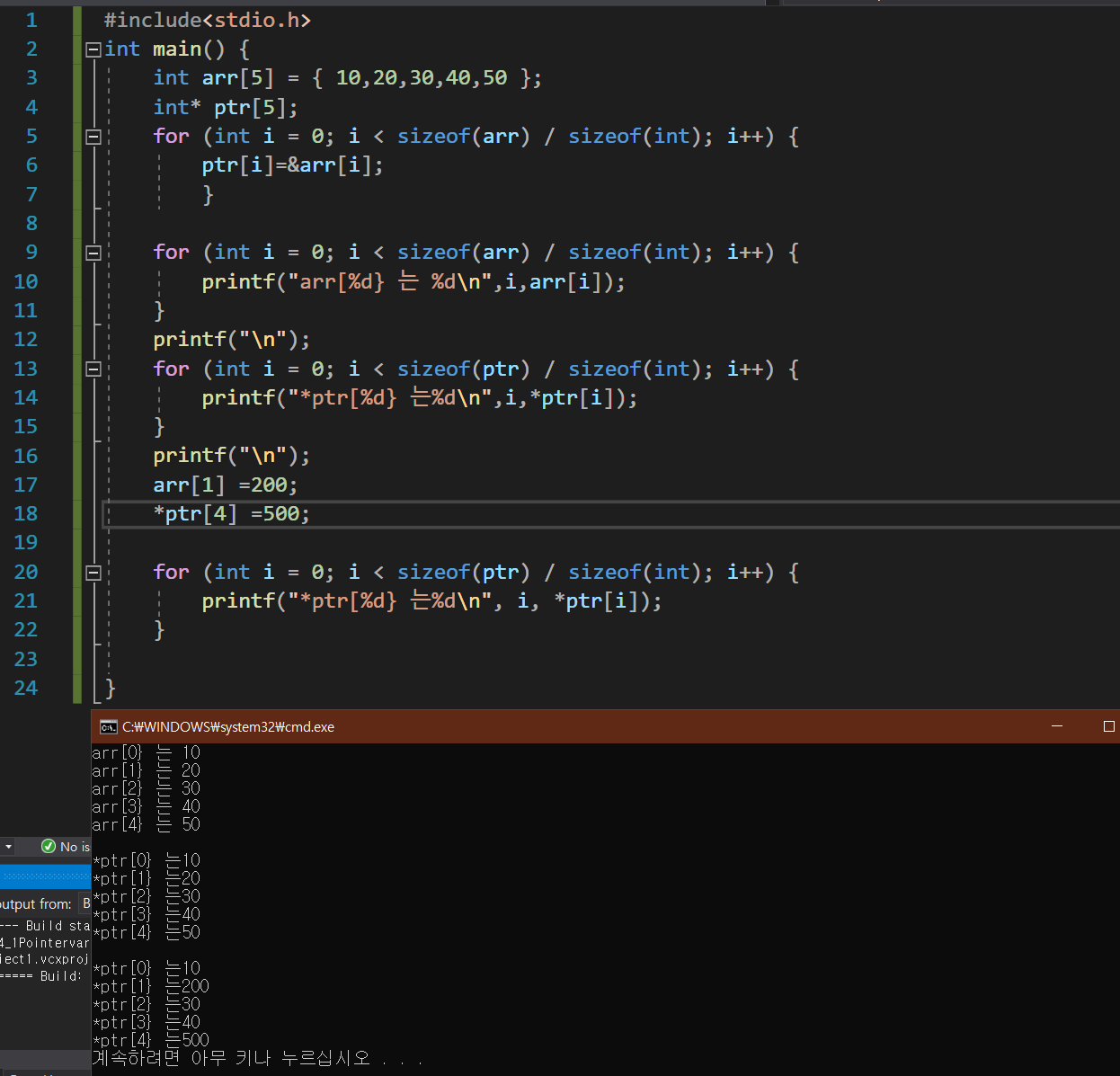 배열에서 값을 변경하고 포인터에서 값을 변경해 보았습니다.