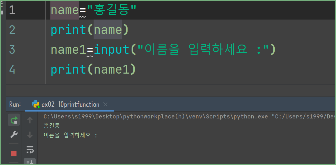 print(name)을 하면 해당 변수의 값을 출력하여 바로 홍길동이 결과값으로 보여집니다.