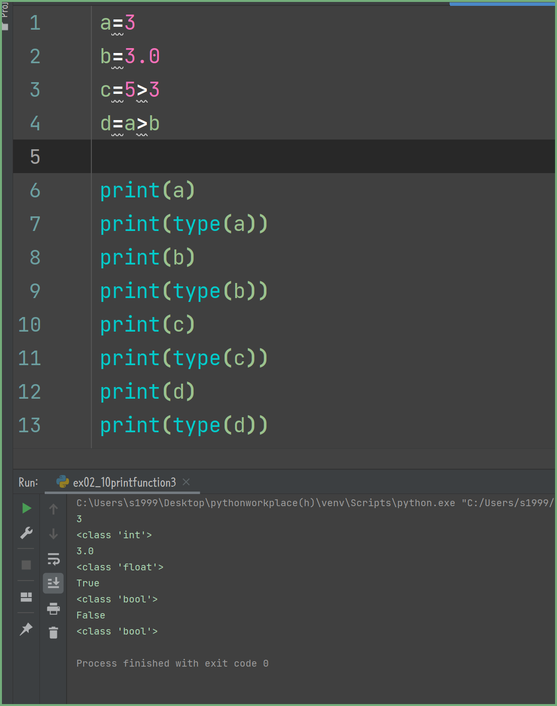 변수 b= 3.0을 넣었습니다. 누가 봐도 3 이지만 3과 3.0은 다릅니다. 이는 정수와 실수의 차이로 생각하면 됩니다. 물론 수학적으로 개념도 다르기는 하지만 여기서는 소수점이 있느냐 없느냐로 판단하겠습니다. 정수와 소수를 표현하는 방식의 차이가 있습니다. 단순하게 소수점이 있으면 float로 나타나는구나 정도로 생각하면 될 듯합니다.