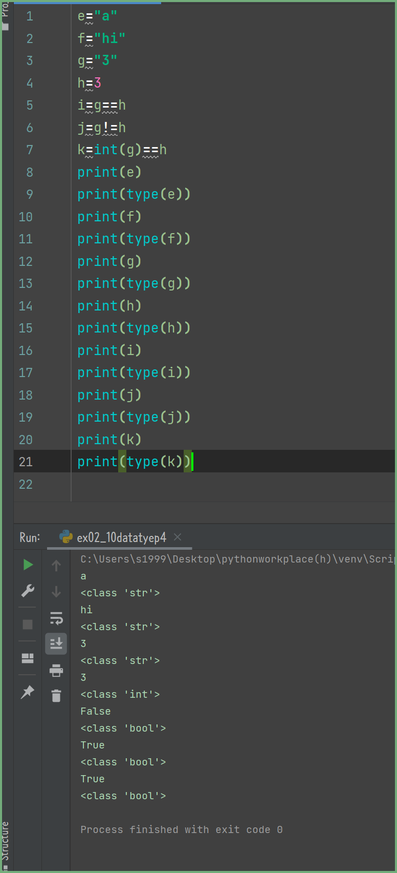 e 값은 문자 a 입니다. ' ', "" 안에 들어가 있으면 변수를 의미하는 것이 아닌 문자를 의미합니다. 문자열은 문자가 2개 이상 있는 것을 말하는데 파이썬은 문자와 문자열을 같은 str 로 자료형을 나타냅니다.