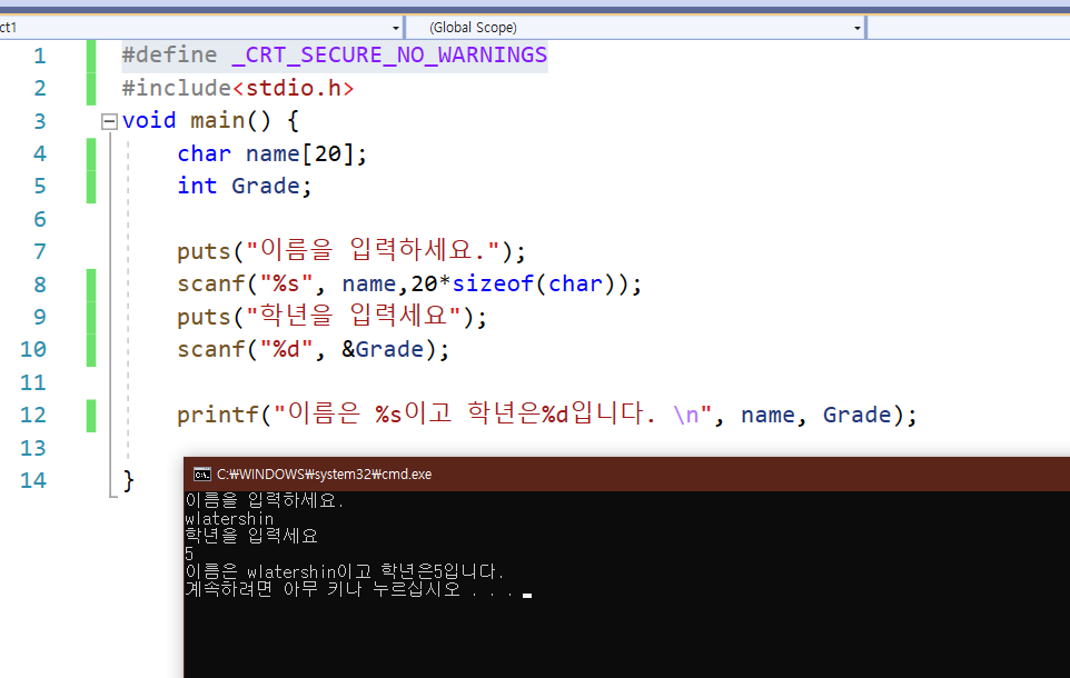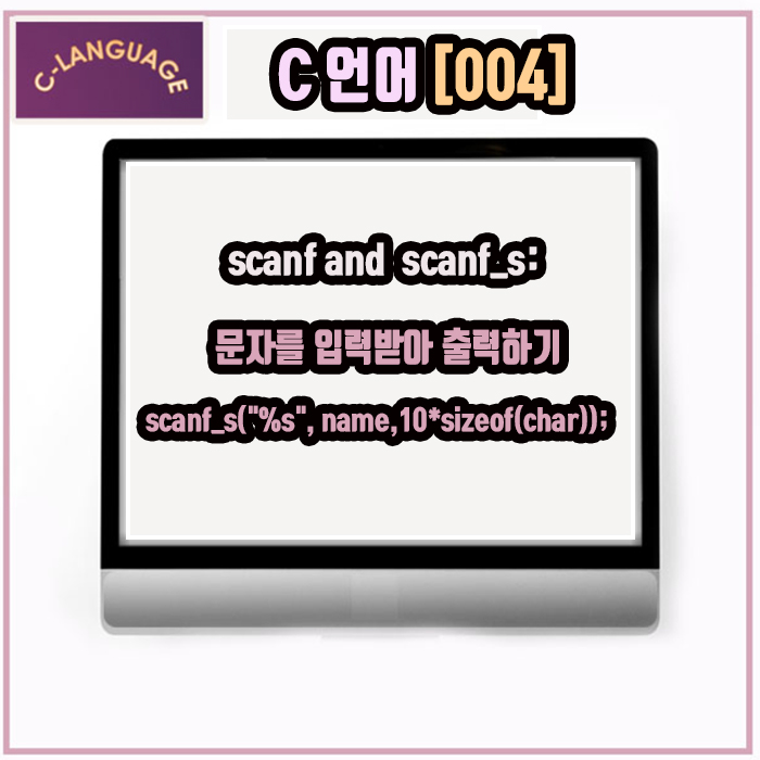 c 언어[004] scanf and scanf_s: scanf_s("%s", name,20*sizeof(char)); 문자를 입력받아 출력하기에 대해 알아보겠습니다. 다. c 언어에서 scanf는 상당히 많이 사용되며, scanf_s와 동일합니다. 비쥬얼 스튜디오 2019에서 헤더파일 앞에 문구하나 더 넣어서 해결할 수 있는데 어디까지나 프로그래밍 언어상의 차이이니 큰 차이는 없습니다. scanf에 대해 알아보겠습니다.