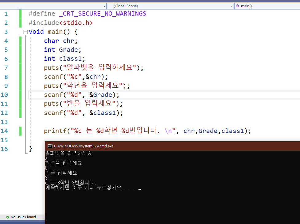 printf("%c 는 %d학년 %d반입니다. \n", chr,Grade,class1);