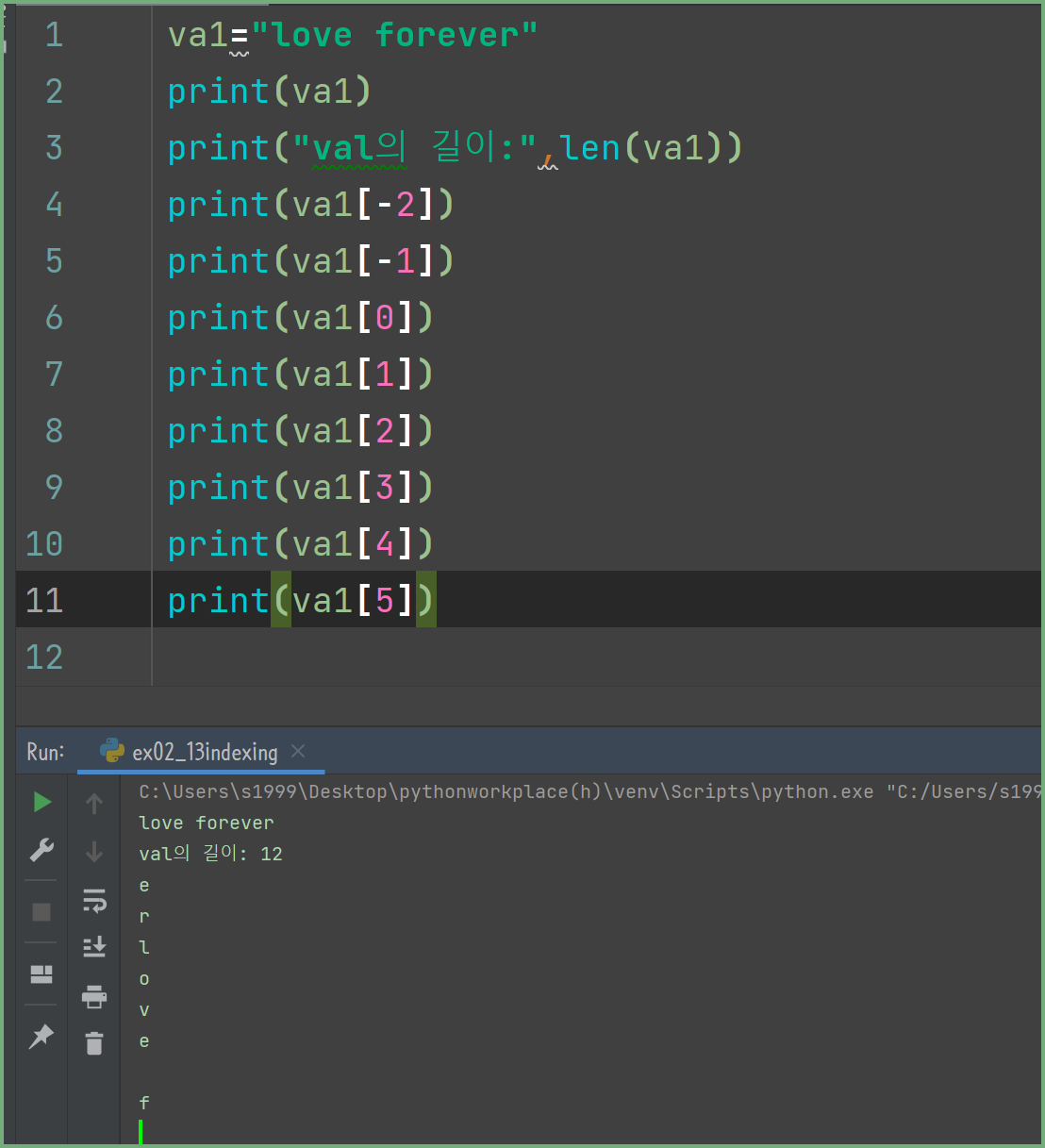 val1 을 쓰면 변수 전체 값이 출력되지만 변수명[숫자]형태로 하면 해당하는 번호에 값이 출력되게 됩니다. 이를 인덱스라고 인덱스의 넘버링은 0번부터 시작입니다.
