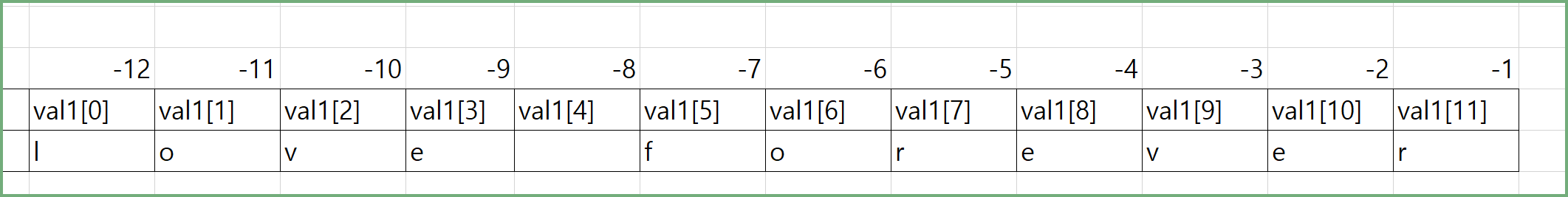 음수의 경우는 주어진 문자열을 뒤부터 순차적응로 진행합니다. 이는 문자열의 크기에 따라서 마지막 문자가 인덱스 번호가 거꾸로 감소하게 됩니다.
