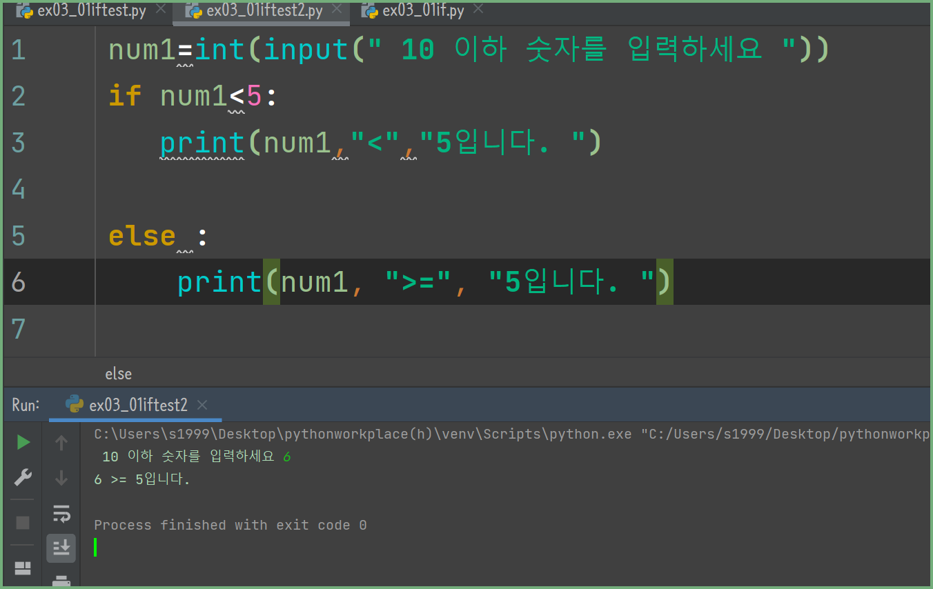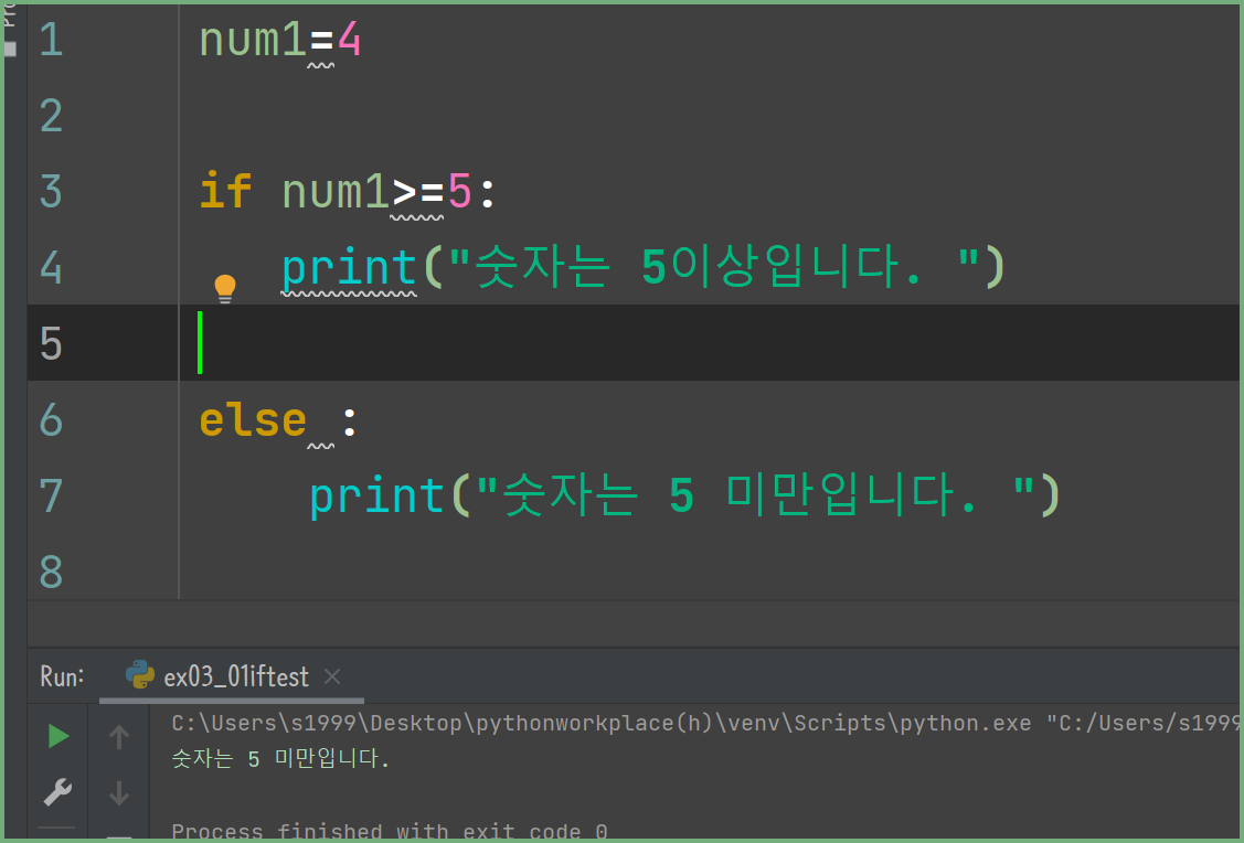 num1이 6이므로 조건을 만족합니다. 그래서 출력값을 숫자는 5 이상입니다가 출력되는 것을 볼 수 있습니다.