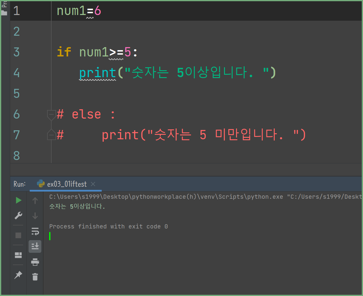 변수에 6이 저장되어있습니다. 조건문 if 이후 num1 >=5 즉 숫작 5보다 크거나 같다면 - 숫자는 5 이상입니다를 출력하게 됩니다.
