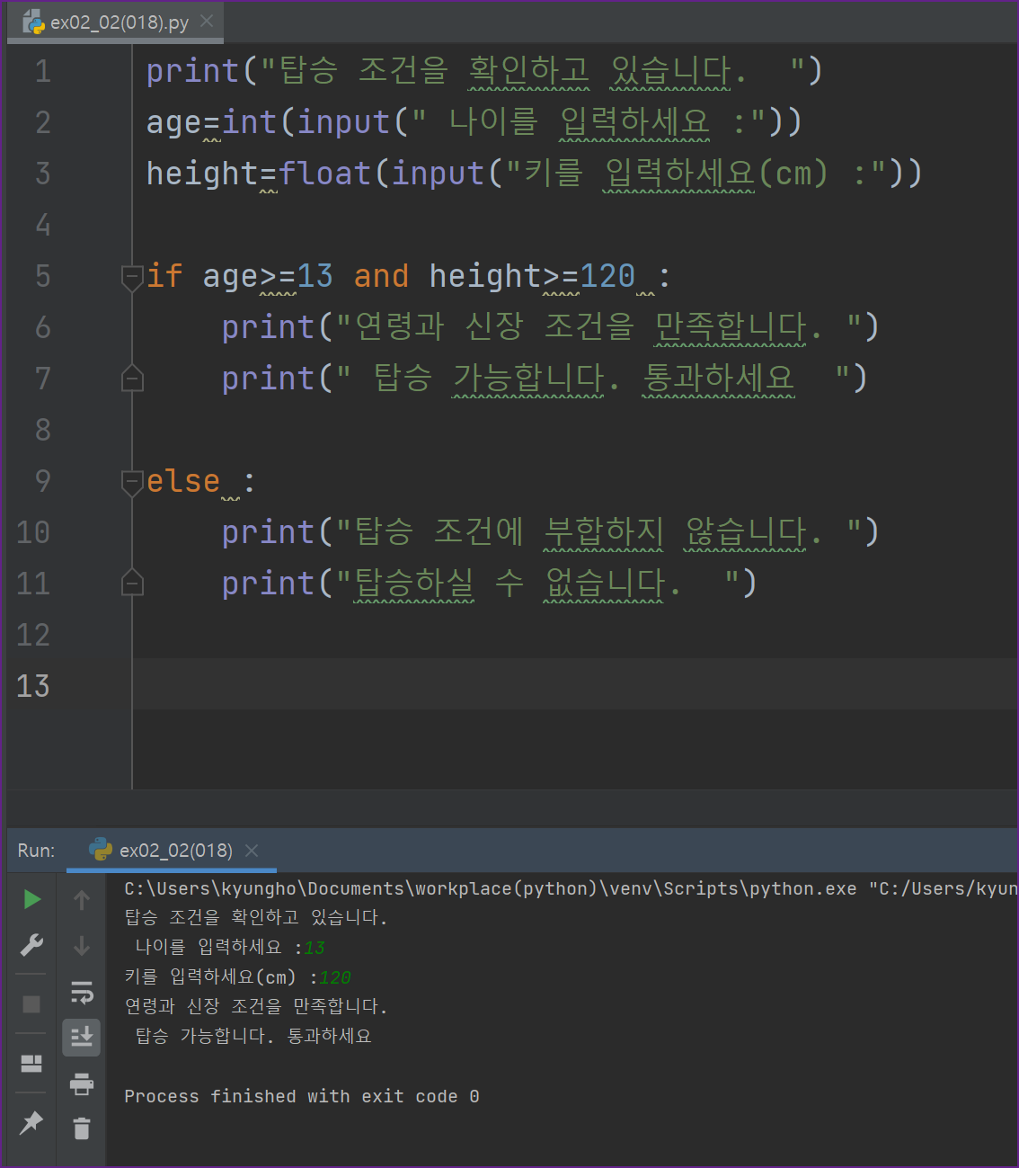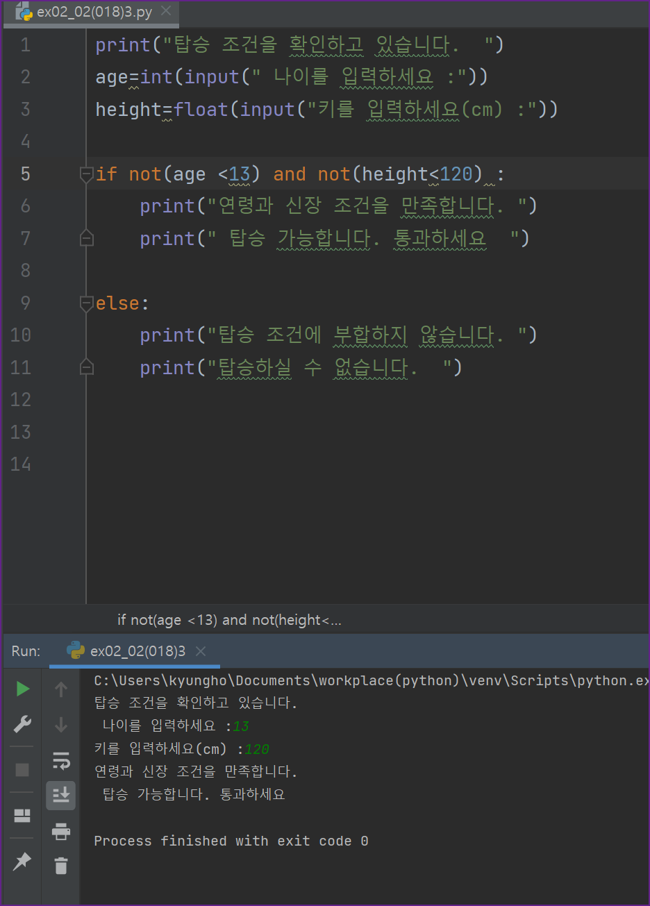 키와 신장 조건을 만족하면 이후 조건문 내용을 실행하게 됩니다.