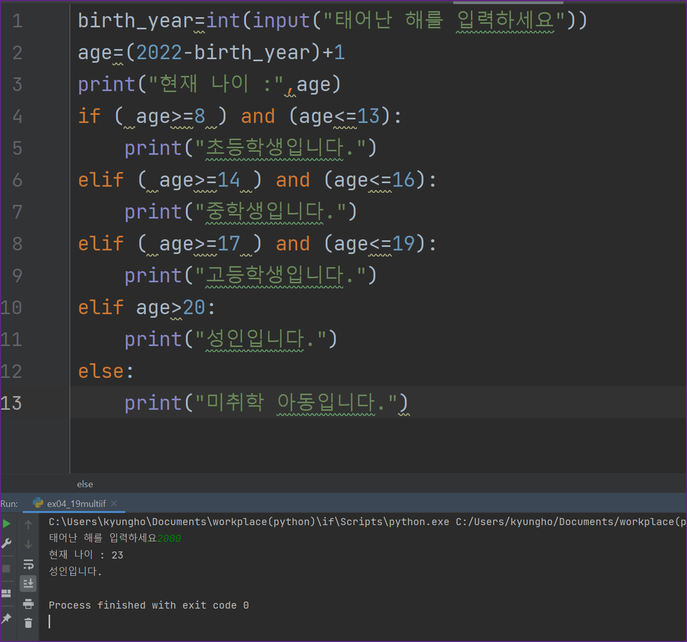파이썬 초급 #023 조건문 if elif 문 예시 2022년 현재 나이 알려주는 프로그램에 대해 알아보겠습니다