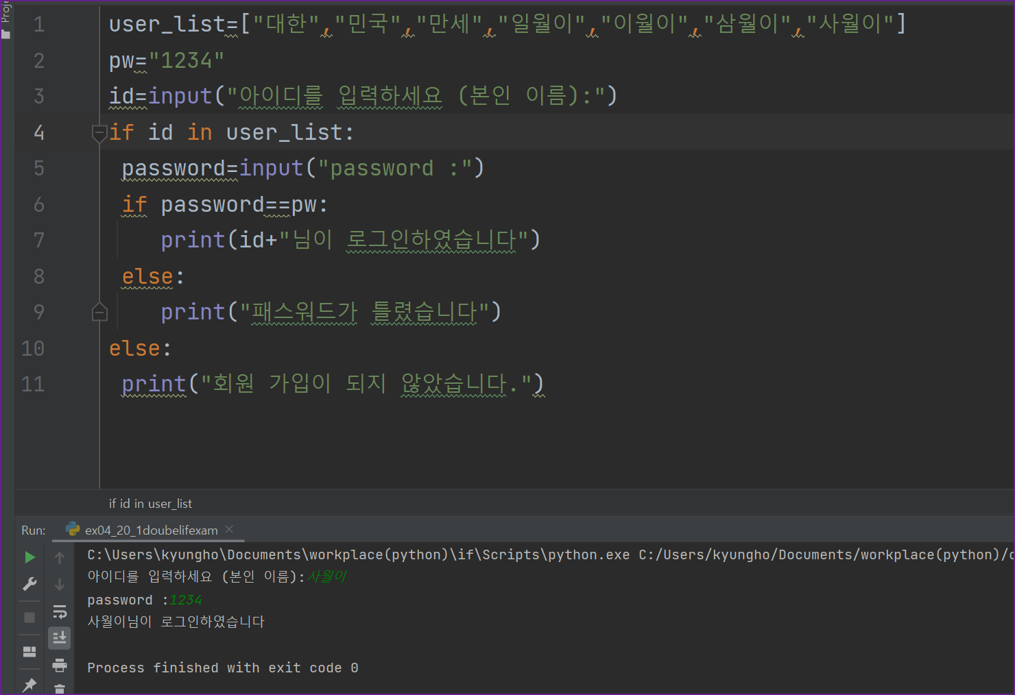 아이디를 입력받고 그 아이디가 없다면 패스워드를 입력할 필요가 없는 구조입니다. 그래서 첫번째 if 문이 참이 아니라면 바로 else 문으로 회원가입이 되지 않았습니다를 실행하고 종료가 됩니다.