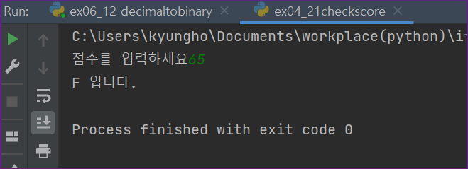 65점을 입력하니 어느 조건도 만족하지 못하여 F입니다를 실행시킵니다.