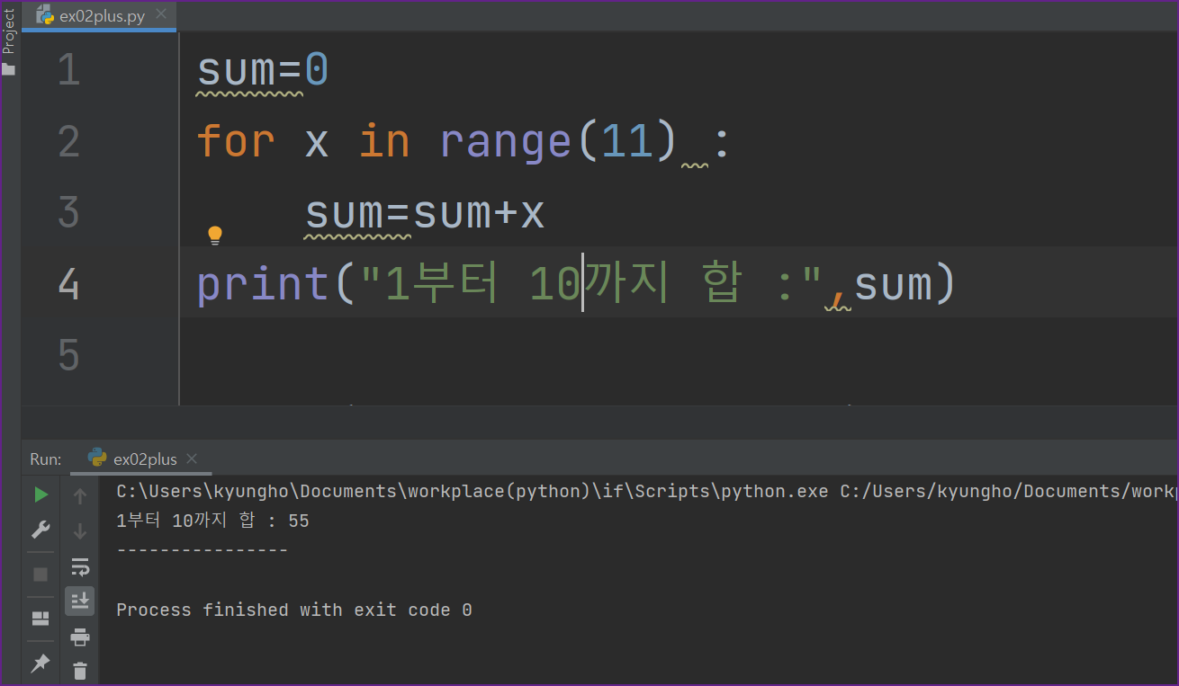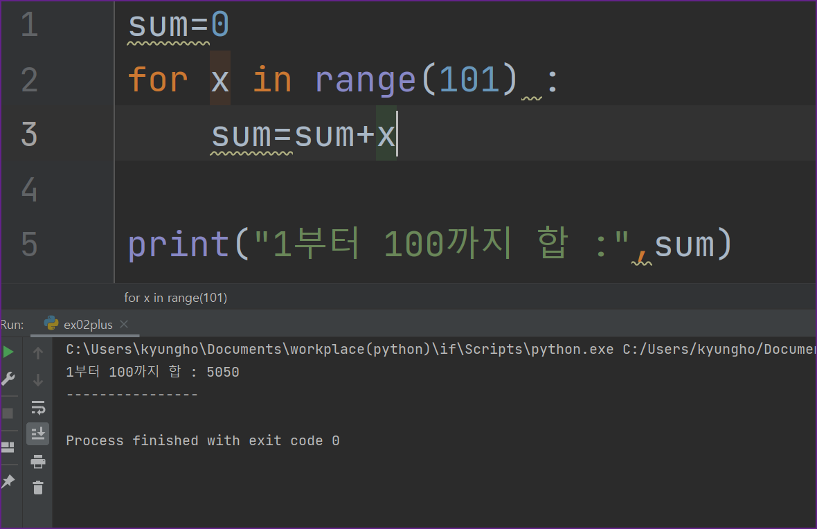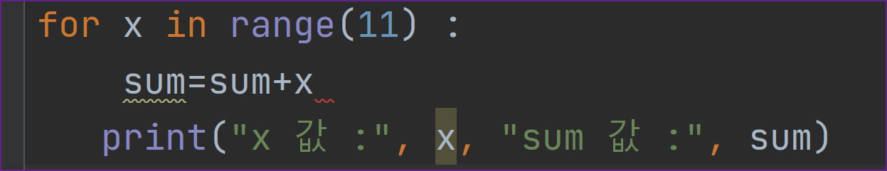 for 반복문에서 들여쓰기를 보면 x값과 sum 까지 값이 들어가 있는 것을 볼 수 있습니다. 들여쓰기가 되지 않으면 for 문 밖에 있다는 의미이거나 들여쓰기 에러가 발생합니다.
