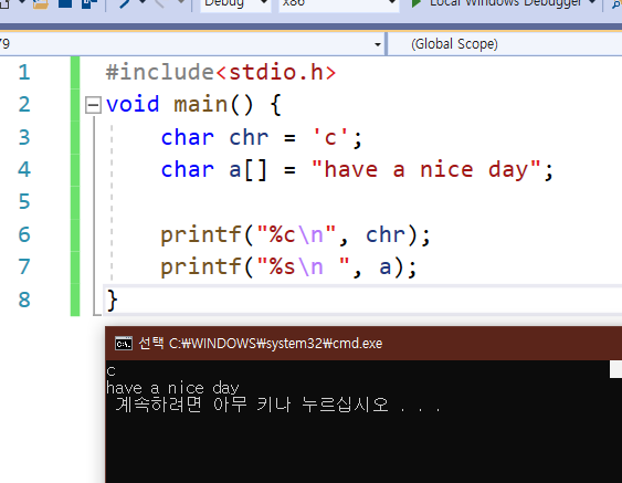 출력하는 함수 printf 안에 바로 문자열을 써도 출력됩니다. 너무나 당연한 것이지만 하지만 변수로 하여 반복하여 사용할때는 역시나 변수에 저장하고 그것을 출력하도록 호출하는게 편리합니다. 말그대로 1회용이냐 다회용이나 차이이고 코딩을 할때는 역시가 변수로 저장 즉 메모리에 저장하여 사용하는 것이 코드가 간단해 집니다.