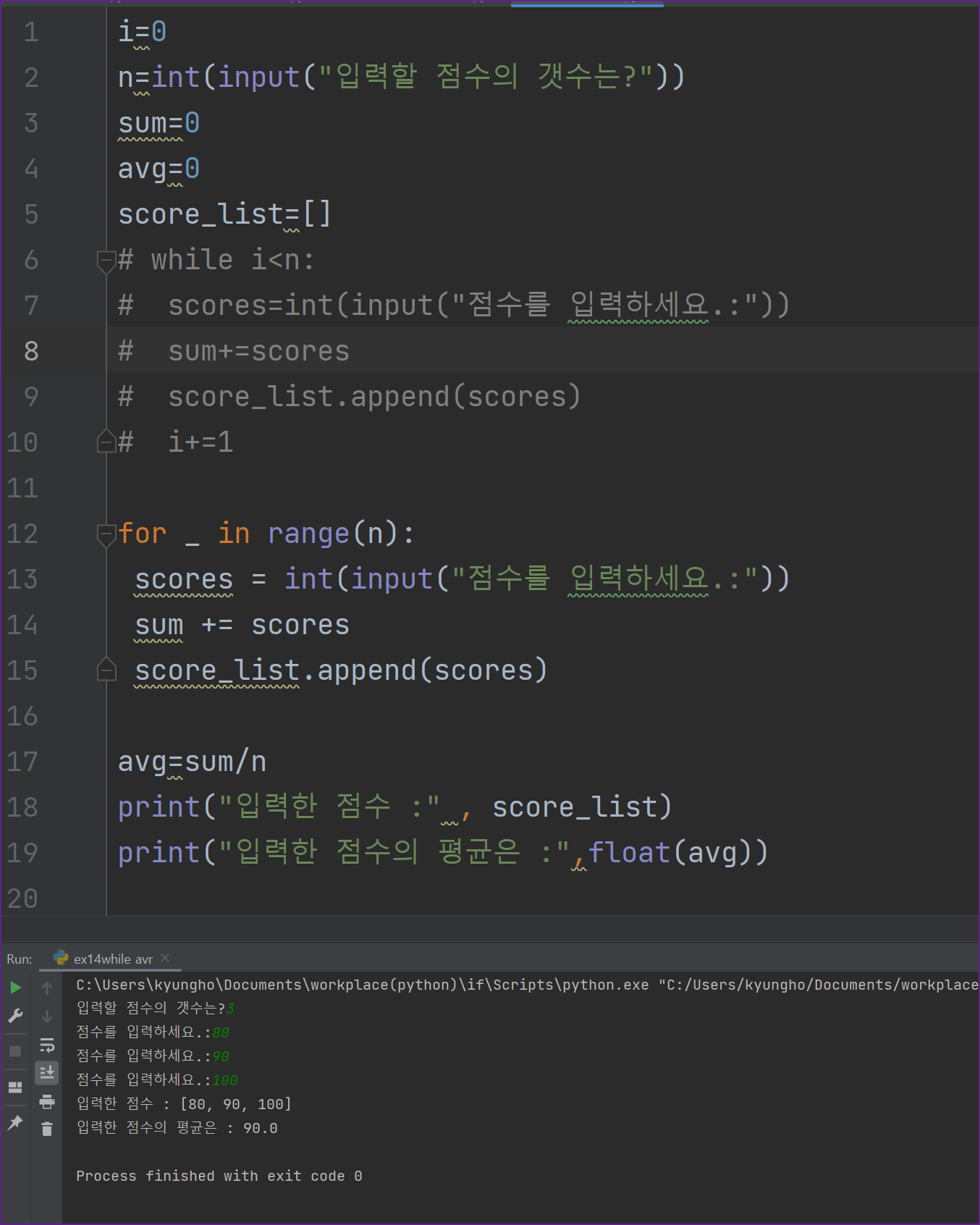 물론 하나씩 점수를 입력 받아 그만 받을 것인가 물어보는 코드로 할 수 있지만 갯수를 물어보는 것도 해보면 나름 반복문을 이해하는데 도움이 됩니다.
