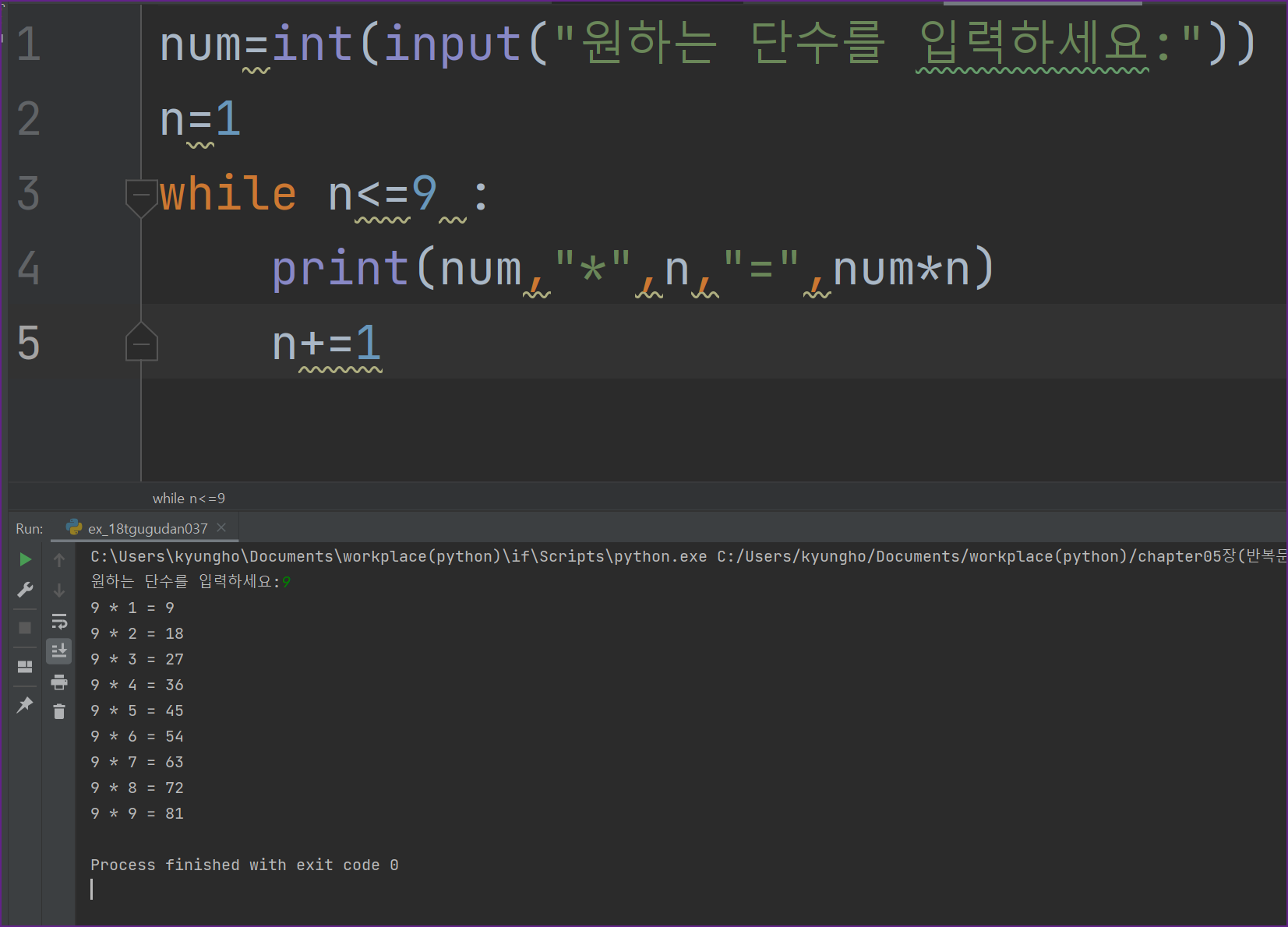 구구단의 경우 반복하는 코드로 작성할 수 있습니다. while True 를 넣어주면 반복하게 되는데