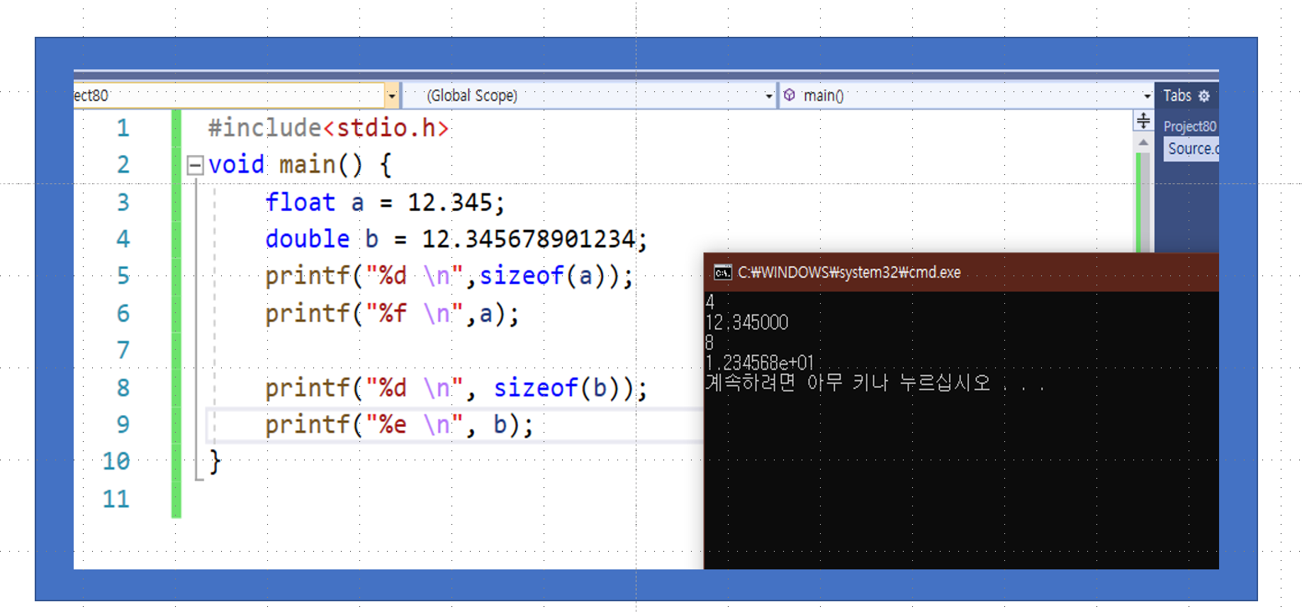 printf("%d \n", sizeof(b)); --> 변수 b 의 크기를 알아보기 위해서 8바이트를 의미하는 8 이나옵니다.