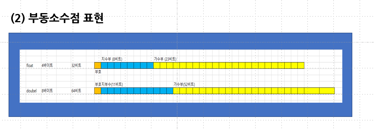 부동 소수점의 경우는 대략적으로 표현할 수 있는 범위만 파악하고 있으면 됩니다. 자세한 것은 따로 설명이 필요한 부분이기 때문에 2진법으로 표현하여 지수와 가수부로 나타내는 방식을 선택하여 수의 정밀도를 높여줍니다.