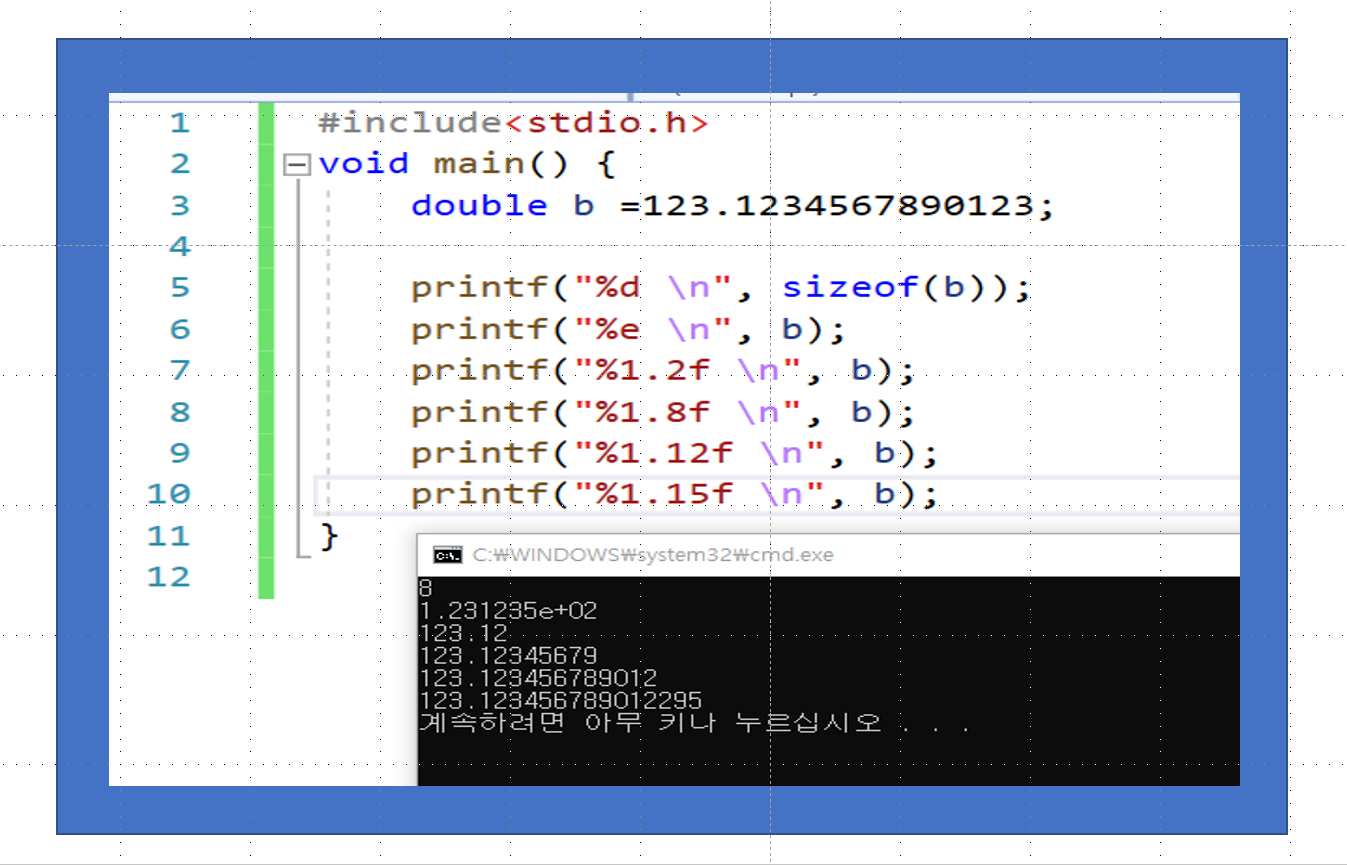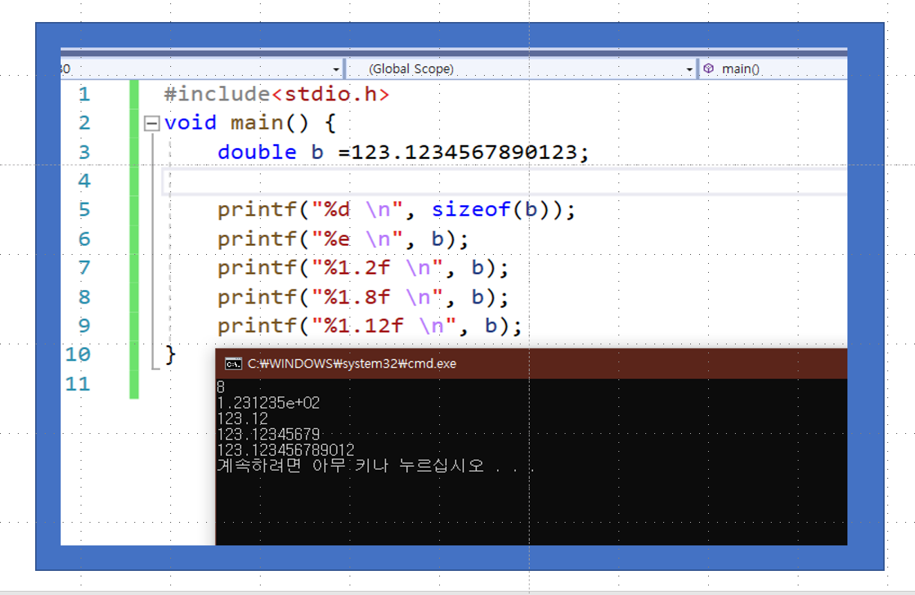 double 형의 경우는 바이트 8바이트임을 알 수 있고 표현할 수 있는 범위에서 유효 숫자 범위도 14자리까지는 정확도가 있다할 수 있습니다.