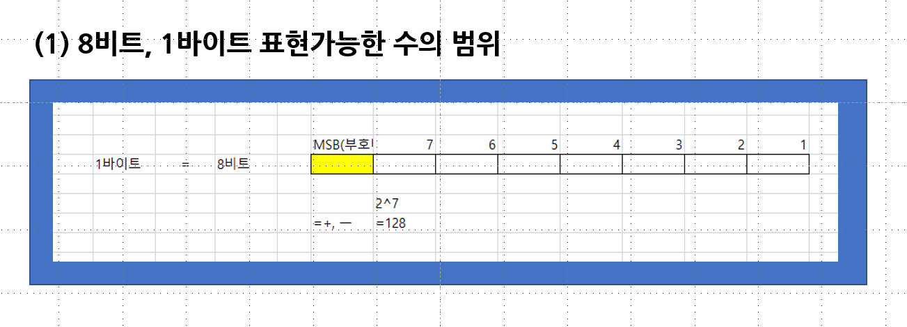 8비트 = 1바이트의 표현가능한 범위는 256개 로 -128~+127입니다.