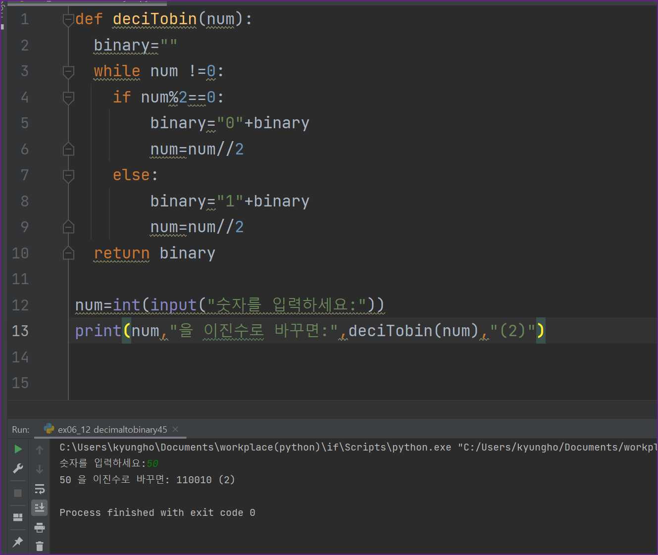print(num,"을 이진수로 바꾸면:",deciTobin(num),"(2)")