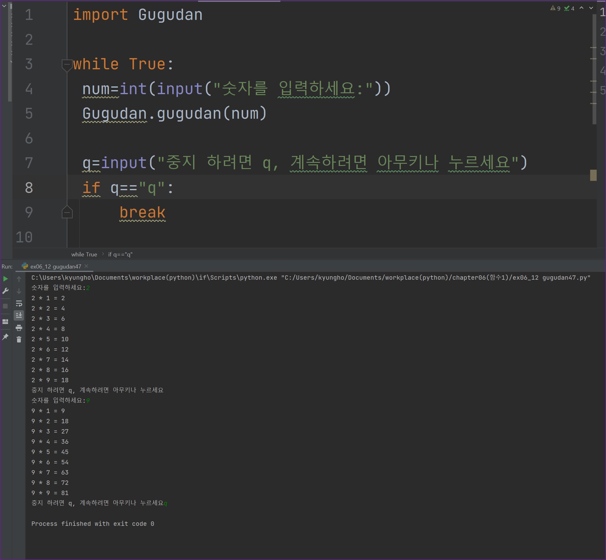 구구단 함수 모듈을 호출하기 위해서 import 파일명을 작성하였습니다.