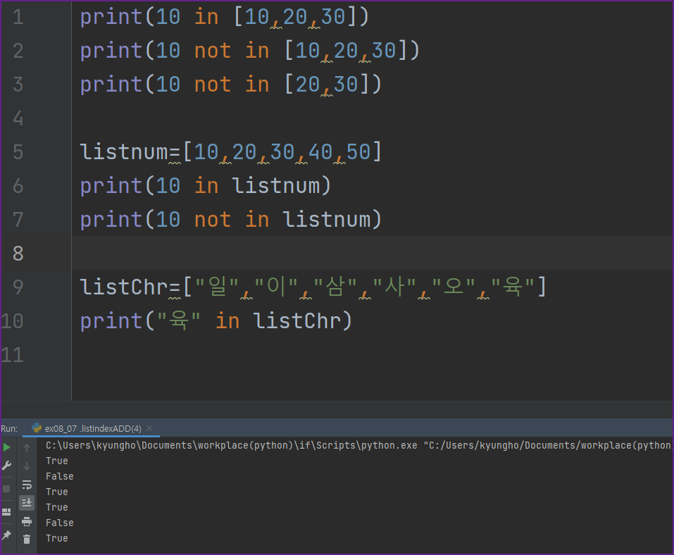 직접 print 함수 안에서 10 in 리스트 적용하여 보면 위 처럼