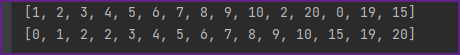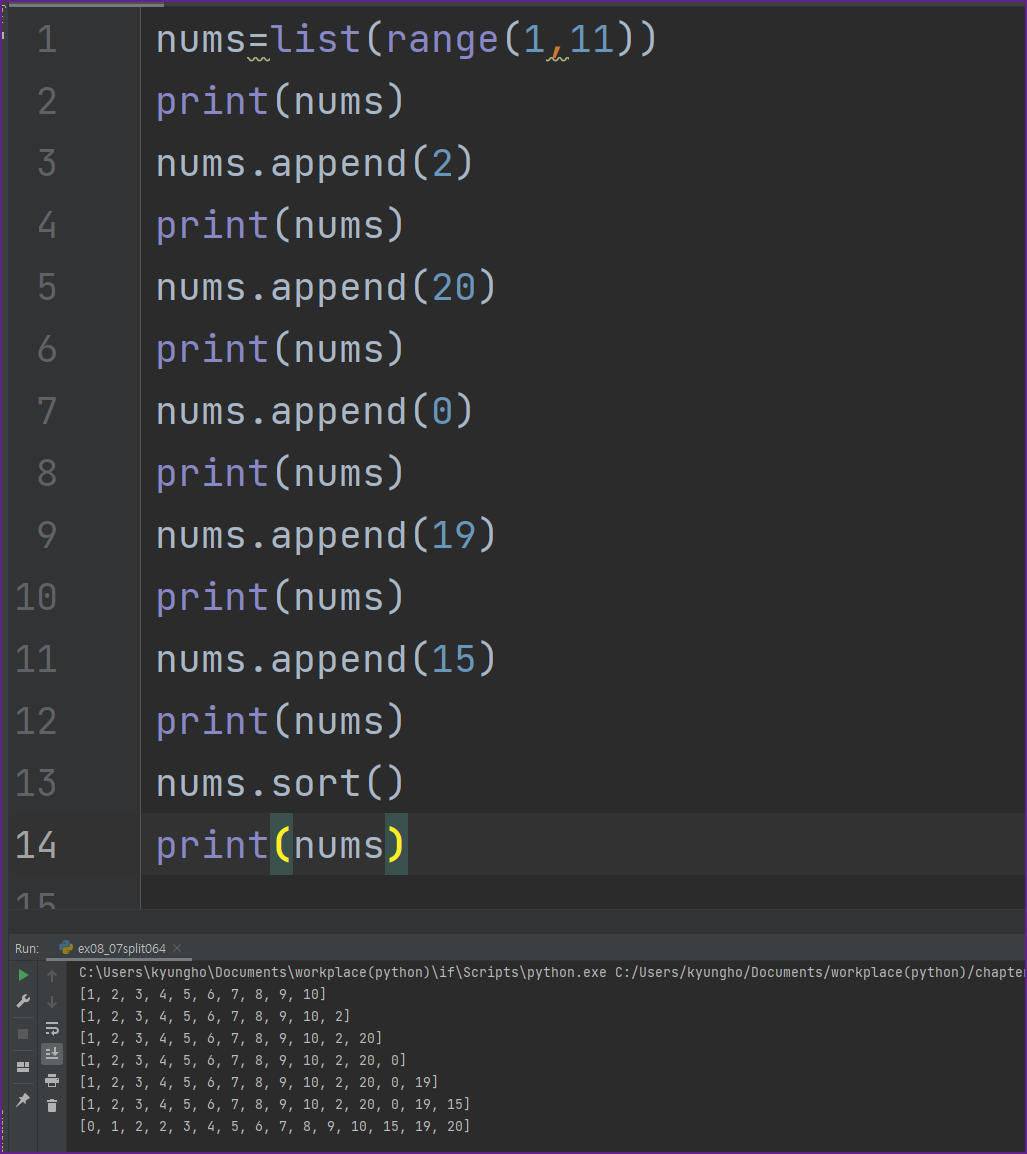 append()함수를 활용하여 순차적으로 뒤쪽으로 2,20,0,19,15를 추가하였습니다.