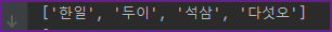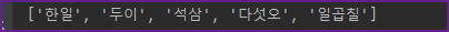 hanja 리스트에 요소값으로 한일, 두이, 석삼, 다섯오를 넣었습니다.