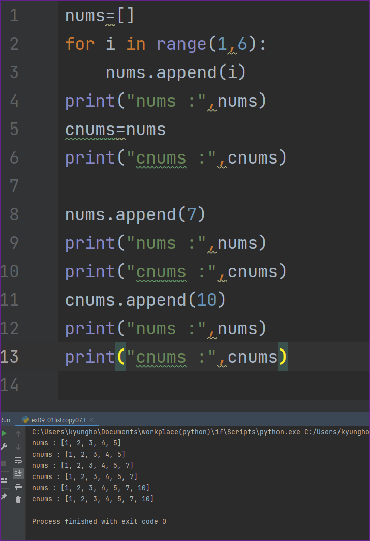 nums 를 먼저 생성하고 이후 nums를 cnums에 대입하였습니다. 일반적인 복사의 개념으로 볼 수 있습니다. 하지만 여기서는 두 리시트 변수가 가리키고 있는 주소값이 동일한 것입니다.