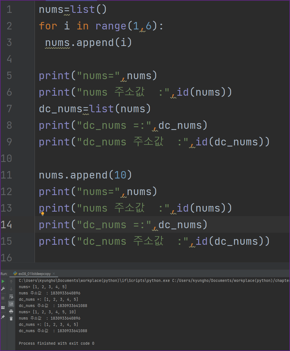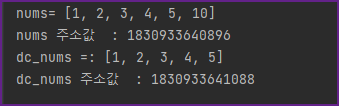 nums의 주소값과 복사본인dc_nums의 주소값이 다른것을 알 수 있습니다.