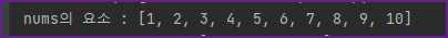 1부터 10까지 요소를 가지고 있는 nums 리스트입니다.