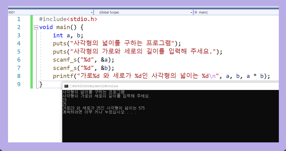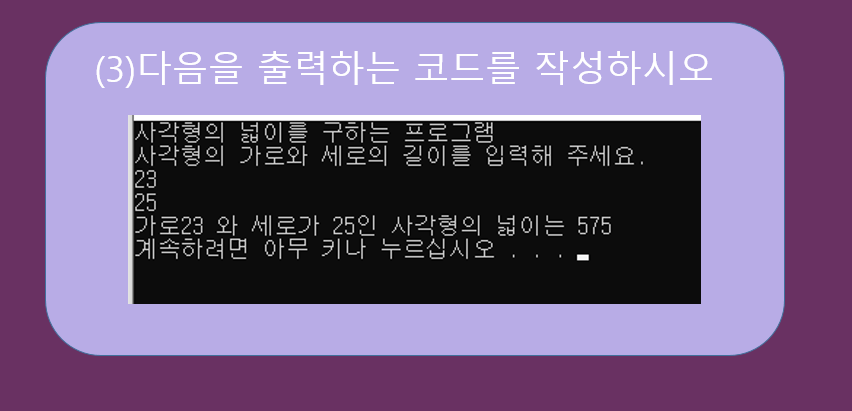 printf("가로%d 와 세로가 %d인 사각형의 넓이는 %d\n", a, b, a * b);