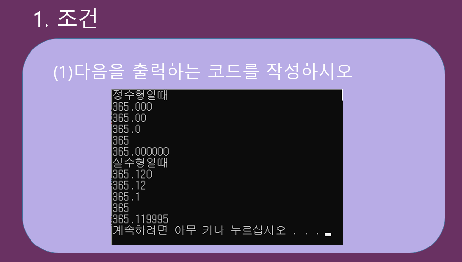 서식이 float 타입일때만 잘 파악하고 있어서도 실수형 출력은 문제가 없습니다. 특히 연산 할때는 형변환과 함께 파악을 잘해야 합니다.