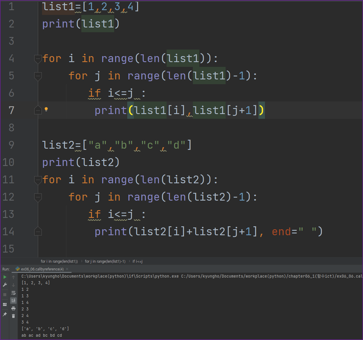 ab,ac,ad,bc,bc,cd를 출력하는 코드