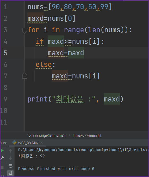 리스트 요소의 크기를 비교하여 최대값을 출력하는 코드