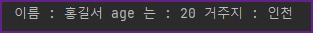print("이름 :",name1,"age 는 :",age1,"거주지 :",area1)