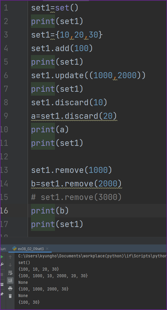set에 요소를 삭제하기 위해서 사용하는 함수로 discard와 remove가 있는데 둘다 반환값은 없습니다.