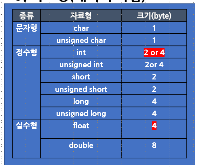 자료형과 크기는 기본적으로 암기를 해야 합니다. c 언는 변수 앞에 자료형이 문자형인지 정수형인지 실수형인 표기를 하기 때문에 직관적으로 이해할 수 있습니다.