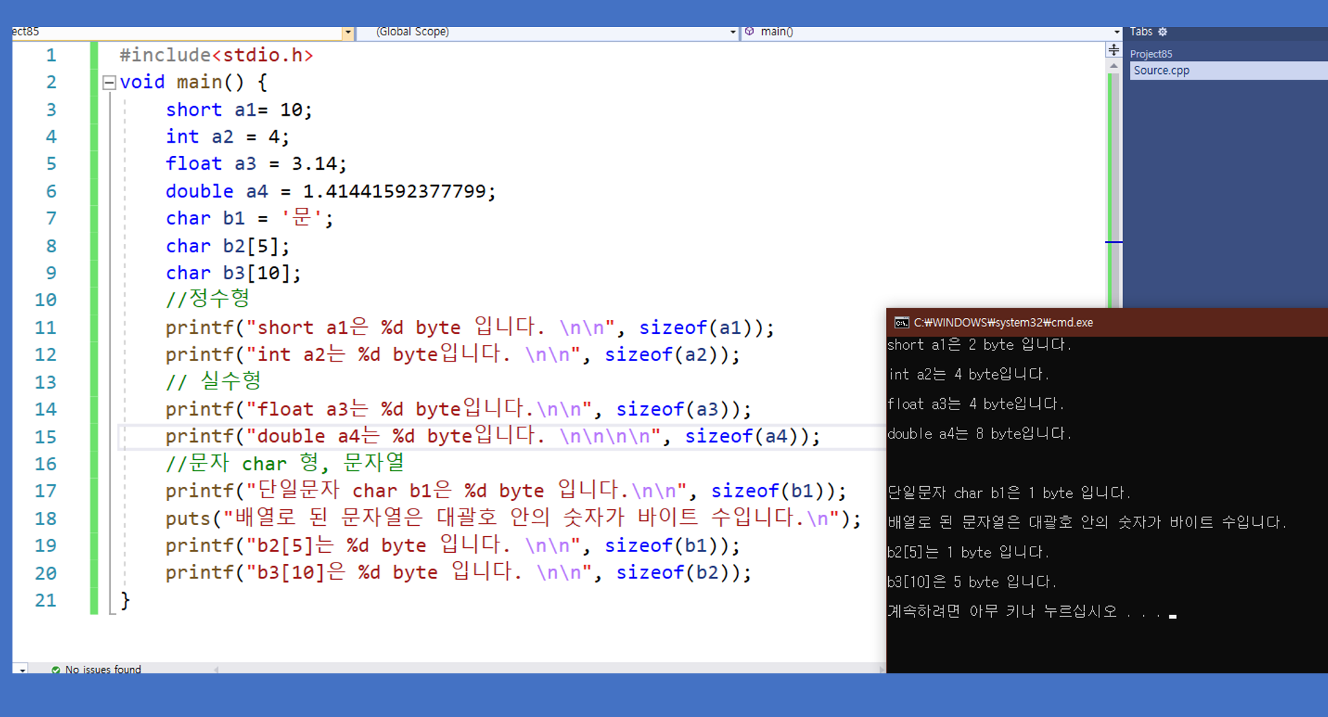 c 언어[011] 사이즈 크기 함수 sizeof(a) 변수의 사이즈를 알아보기데이타 크기 사이즈 알아보는 함수 sizeof(a) 변수의 사이즈 알아보기에 대해 확실히 이해하고 가겠습니다.