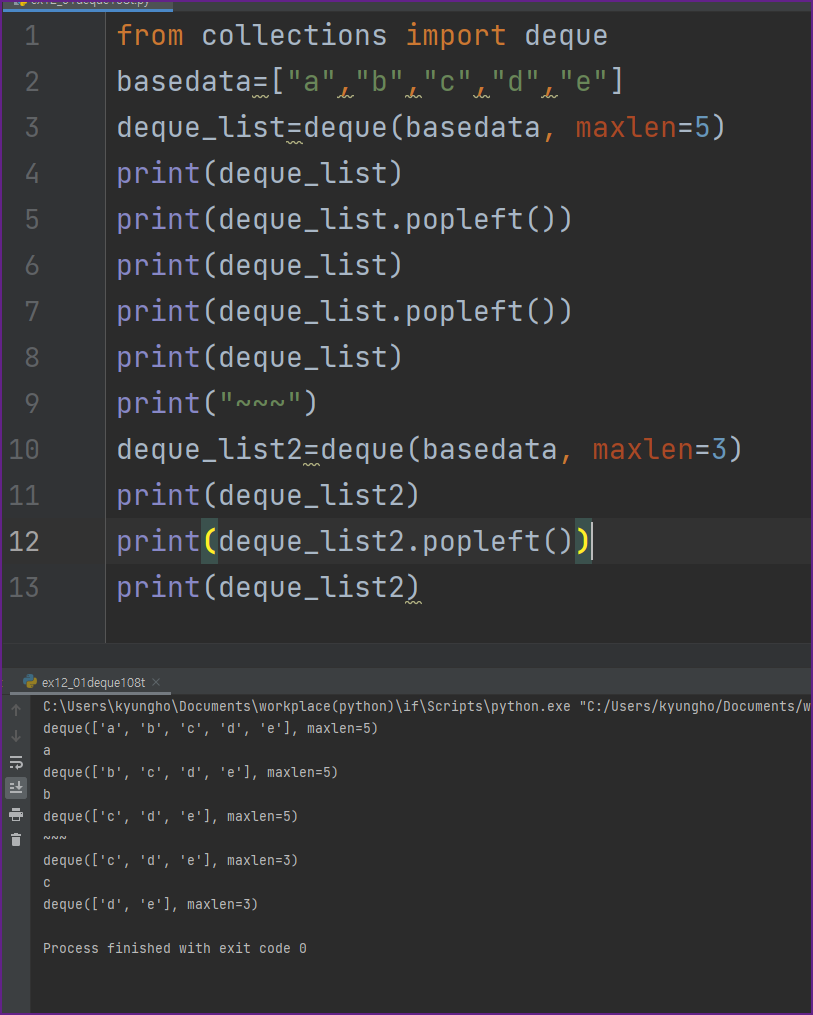 그래서 첫번째 요소가 삭제되고 그 요소가 무엇인지 보여줍니다. 그리고 이후 삭제된 데크 변수의 출력값을 보여줍니다.