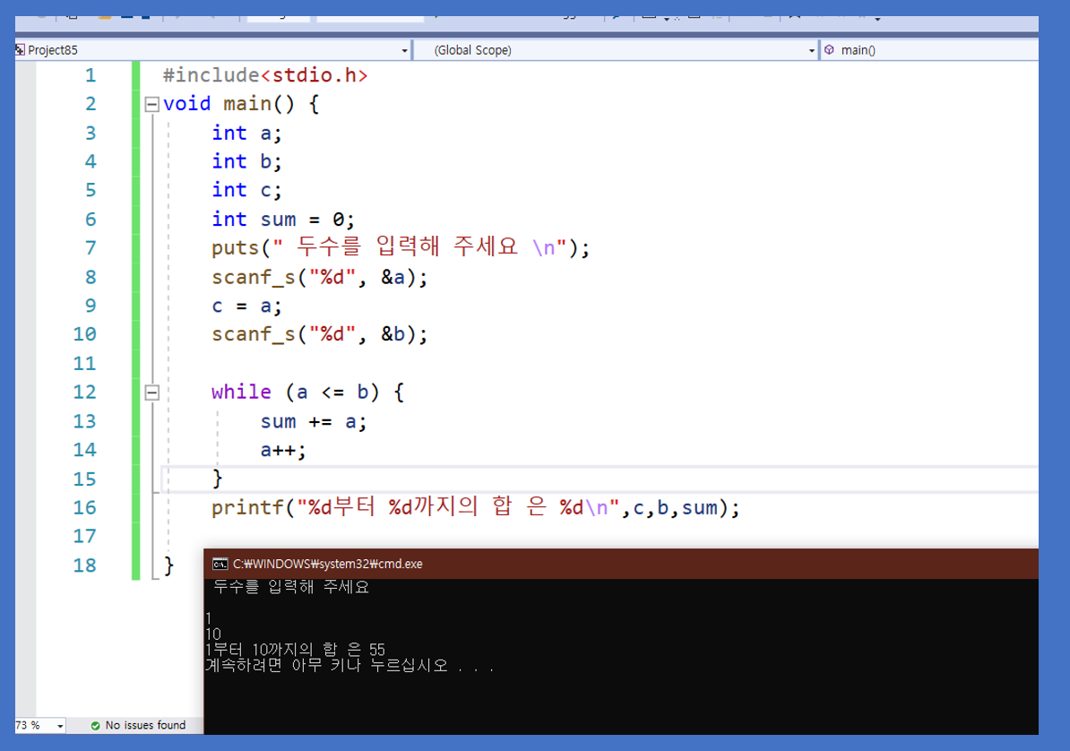 printf("%d부터 %d까지의 합 은 %d\n",c,b,sum);