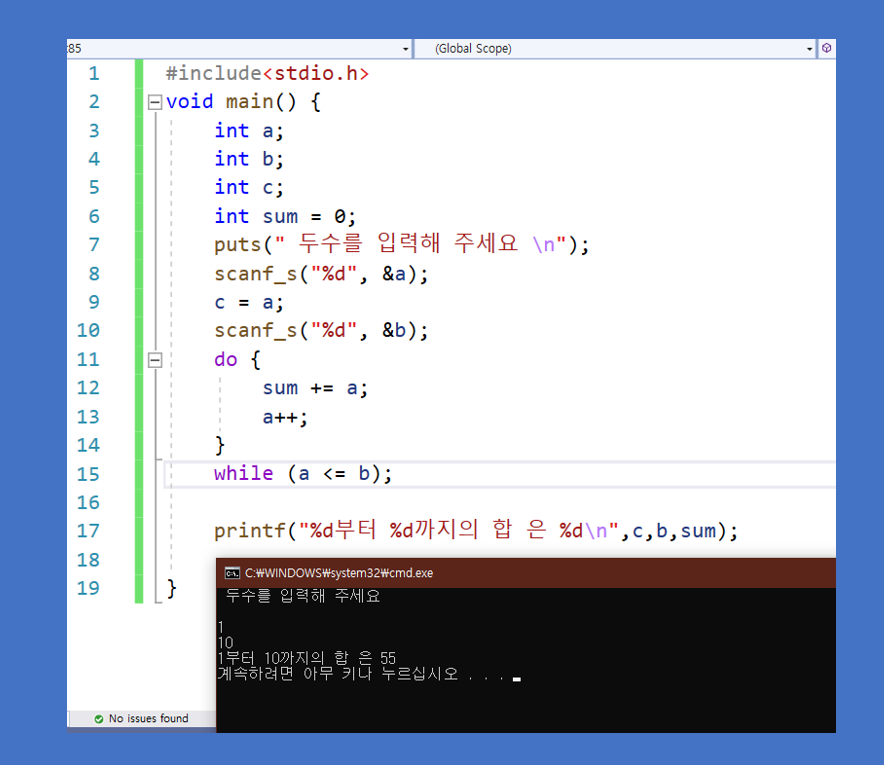 처음 입력한 수 부터 증가를 하기 때문에 처음 입력한 a 값을 c로 저장하여 마지막 문장인 1부터 10까지의 합은 55 로 출력하게 하였습니다.