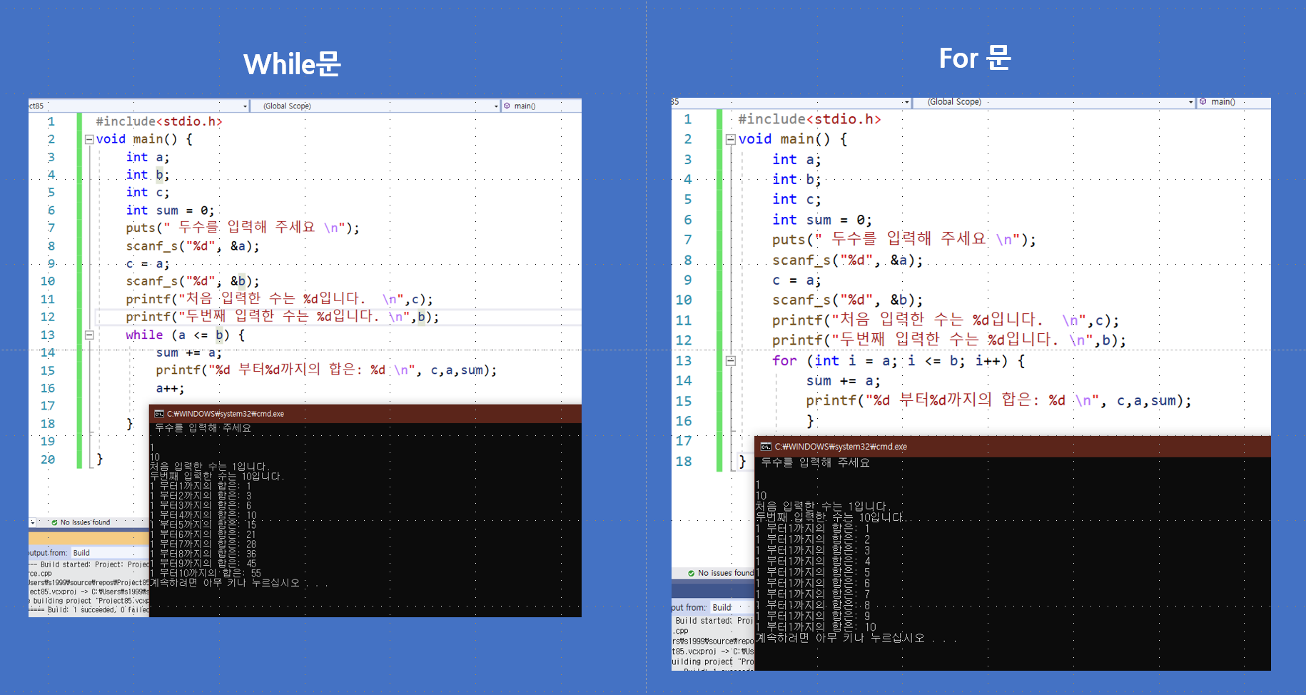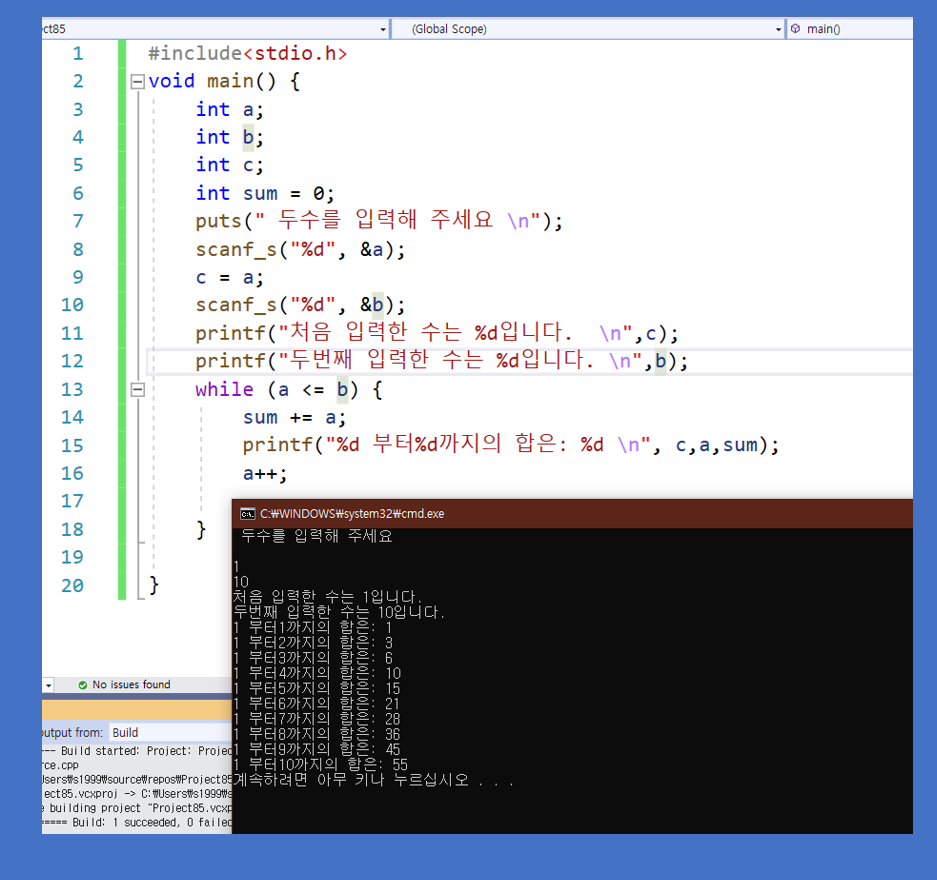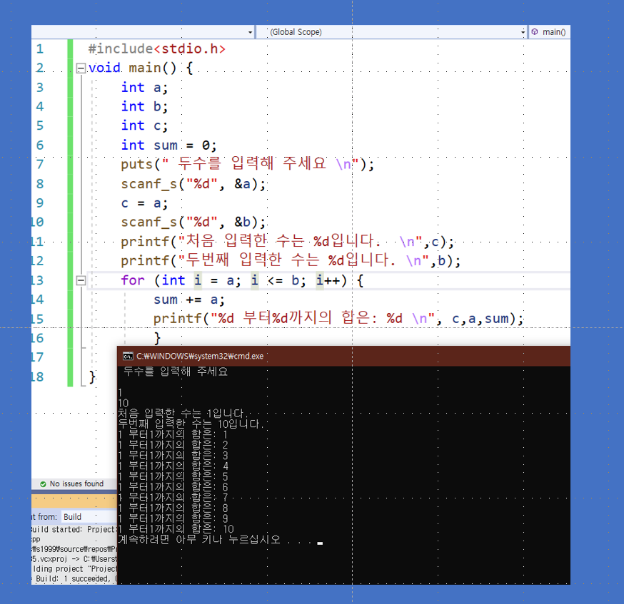 printf("%d부터 %d까지의 합 은 %d\n",c,b,sum); --> c 는 입력 받은 처음 수입니다.