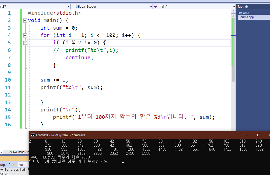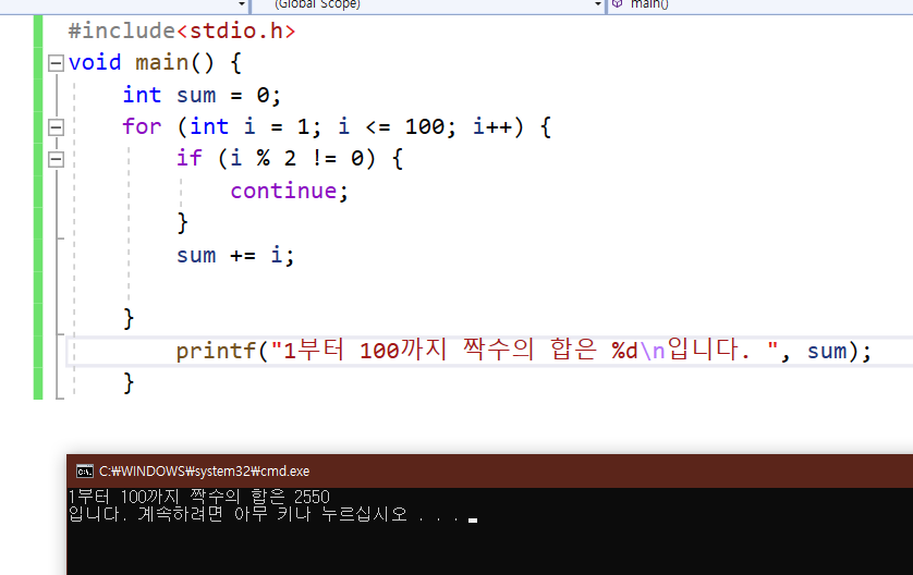 조건식을 변경하면 짝수의 합도 간단하게 만들어 집니다.
