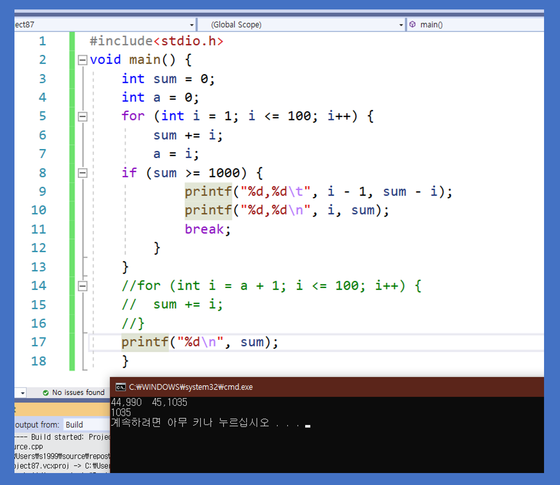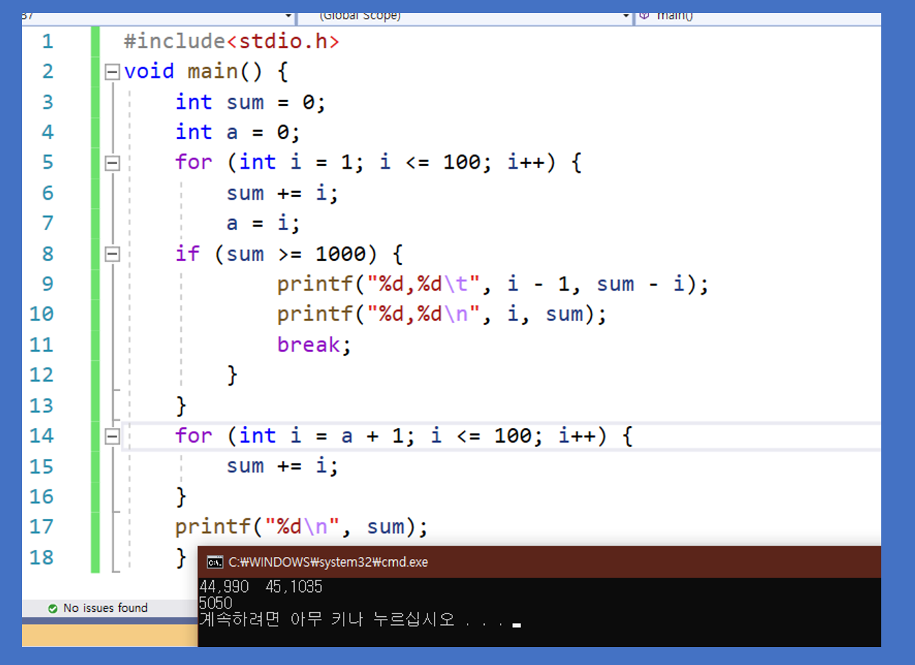 다음은 1부터 100까지 합을 구하면서 중간에 합이 1000이 넘어갈 때의 값을 알아보는 프로그램입니다.