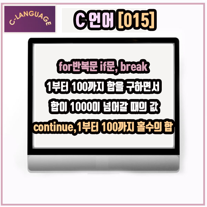 c 언어[015] for반복문 if문, break, 1부터 100까지 합을 구하면서 중간에 합이 1000이 넘어갈 때의 값을 알아보는 프로그램, continue,1부터 100까지 홀수의 합을 구하는 프로그램에 대해 알아보겠습니다. for 문과 if문은 자주 어울려서 많이 사용하고, 또한 break를 통해서 반복되는 것을 중단하게 해 줍니다. 그 메커니즘을 이해하면 다양한 프로그램을 작성할 수 있습니다.